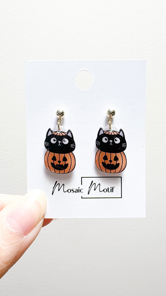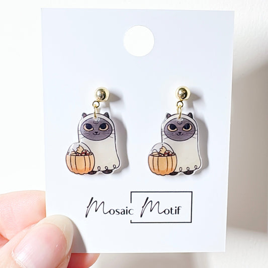 Halloween cat dangle earrings - Siamese with a pumpkin